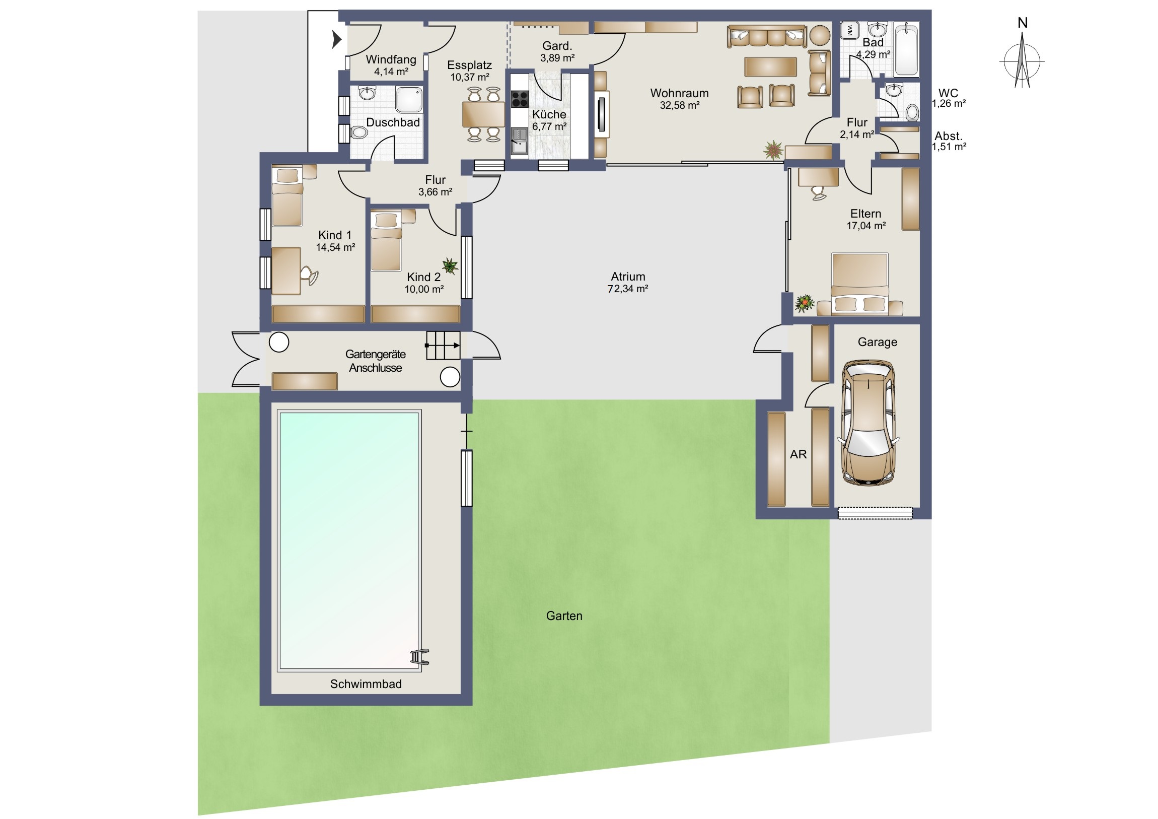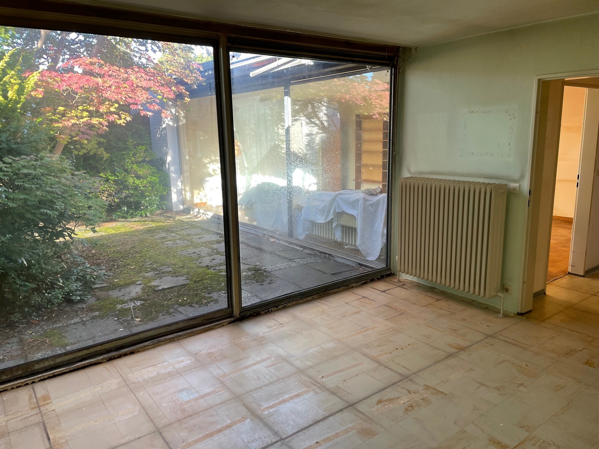 Der Bungalow mit seinen ca. 118 m² Wohnfläche verfügt neben dem Wohn- und Essbereich über drei Schlafzimmer und zwei Bäder. Der Anbau mit dem Schwimmbadbereich (ca. 46 m²) würde sich nach einem Umbau gut als Gästebereich, Arbeitsbereich, Hobbyraum oder ähnliches eigenen. Der Innenhof bzw. das Atrium bietet großzügige 78 m² Freifläche und kann nach einer Neugestaltung die Wohnbereiche optimal ergänzen und den einzigartigen Flair der Architektur unterstreichen. Zusätzlich gibt es einen Gartenbereich, welcher an der Grundstücksgrenze bei Bedarf noch mit einem Sichtschutzzaun versehen werden könnte. Beheizt wird das Haus per Fernwärme. Die Heizungsanlage befindet sich in einem separaten Technikraum.