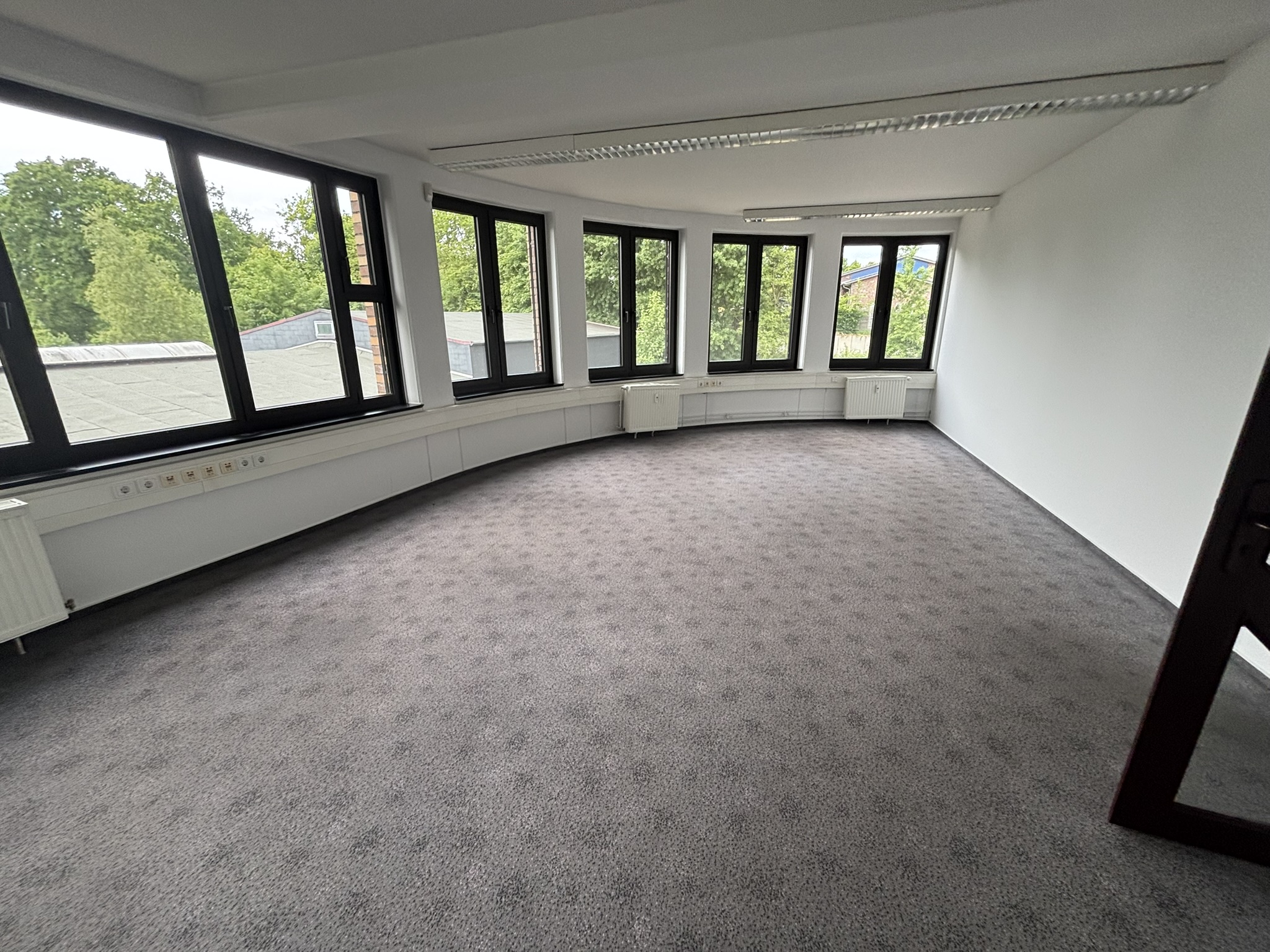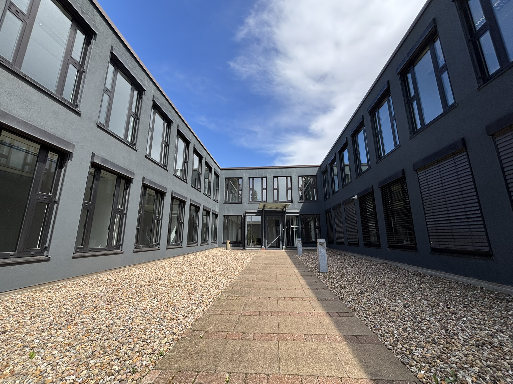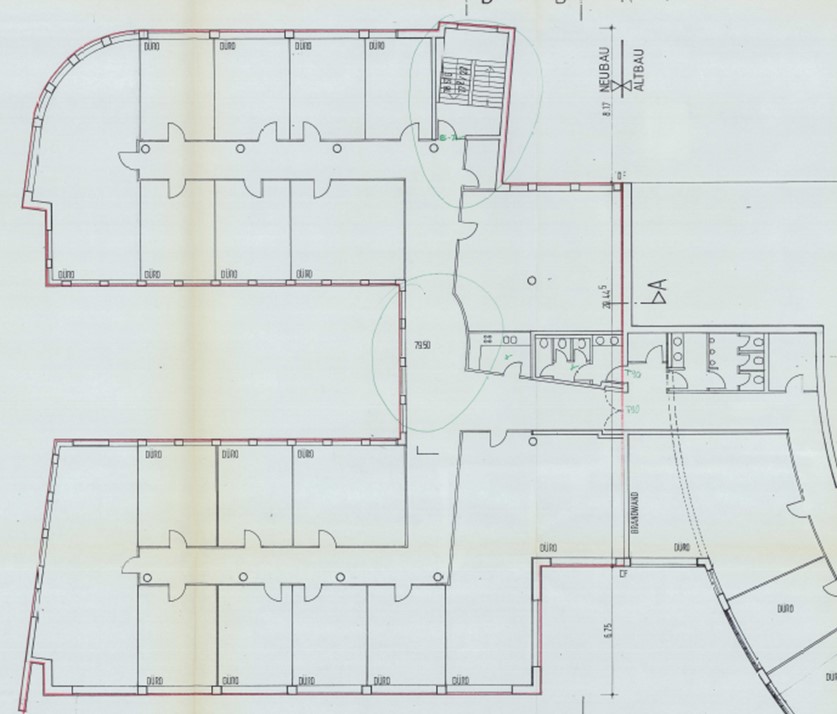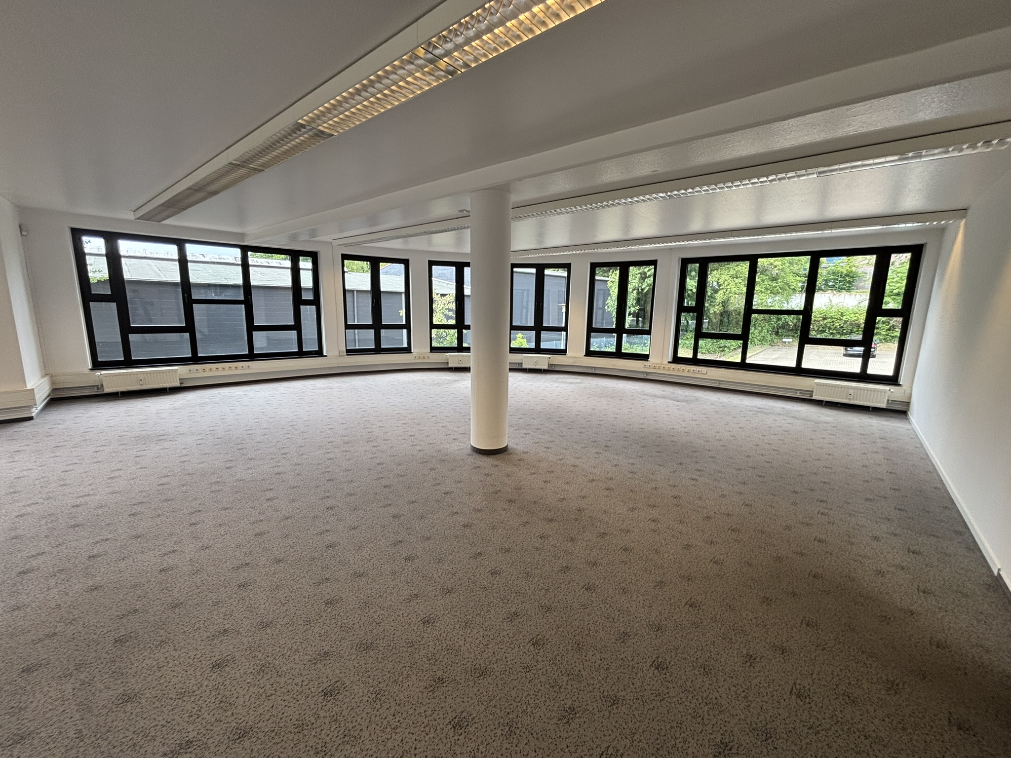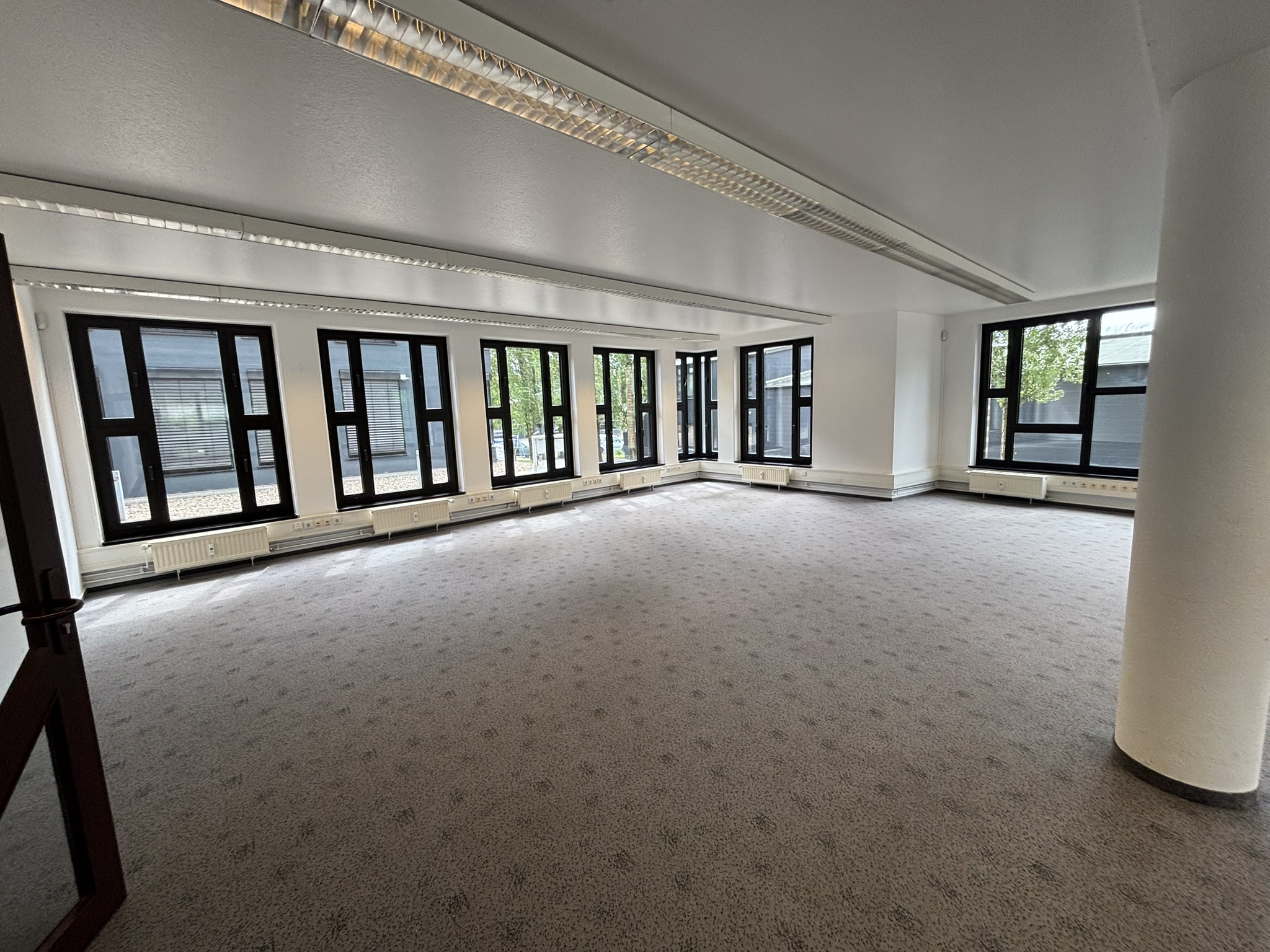 Im EG umfasst die Fläche mit ca. 408 m² die halbe Etage. Hinzu kommt im OG die ganze Etage mit ca. 855 m². Die Innenausstattung und Aufteilung kann nach Bedarf des Mieters angepasst werden und lässt eine sehr vielseitige Nutzung zu. Derzeit besteht das Büro aus einer Mischung aus Einzel- und Doppelbüros sowie auch größeren Räumen, die sich als Großraumbüro oder auch als Schulungsraum, Konferenzraum oder Versammlungsraum eigenen.