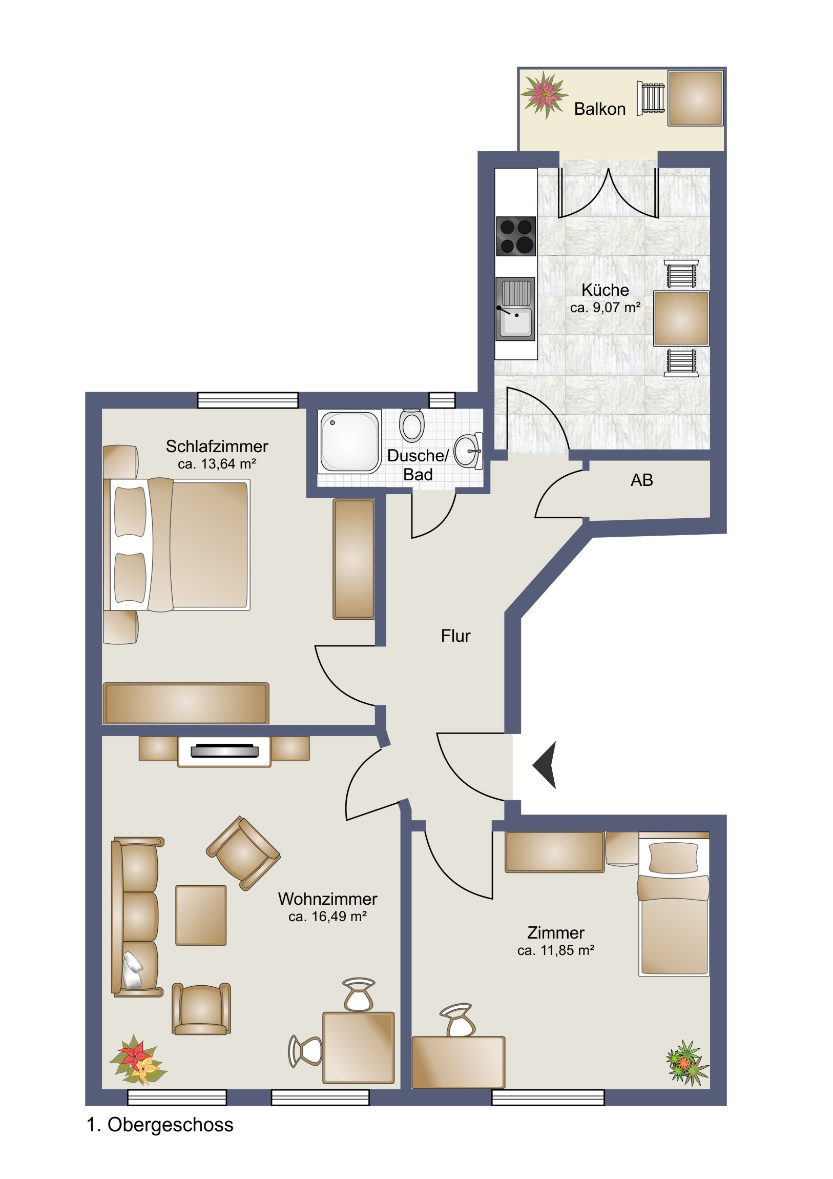 Trotz der überschaubaren Wohnfläche von ca. 61 m² bietet die Wohnung mit den 3 Zimmern erstaunlich viel Platz. Neben den 3 Räumen und dem Flur gibt es noch ein kleines Duschbad sowie einen Abstellraum und die Küche inklusive Essplatz.