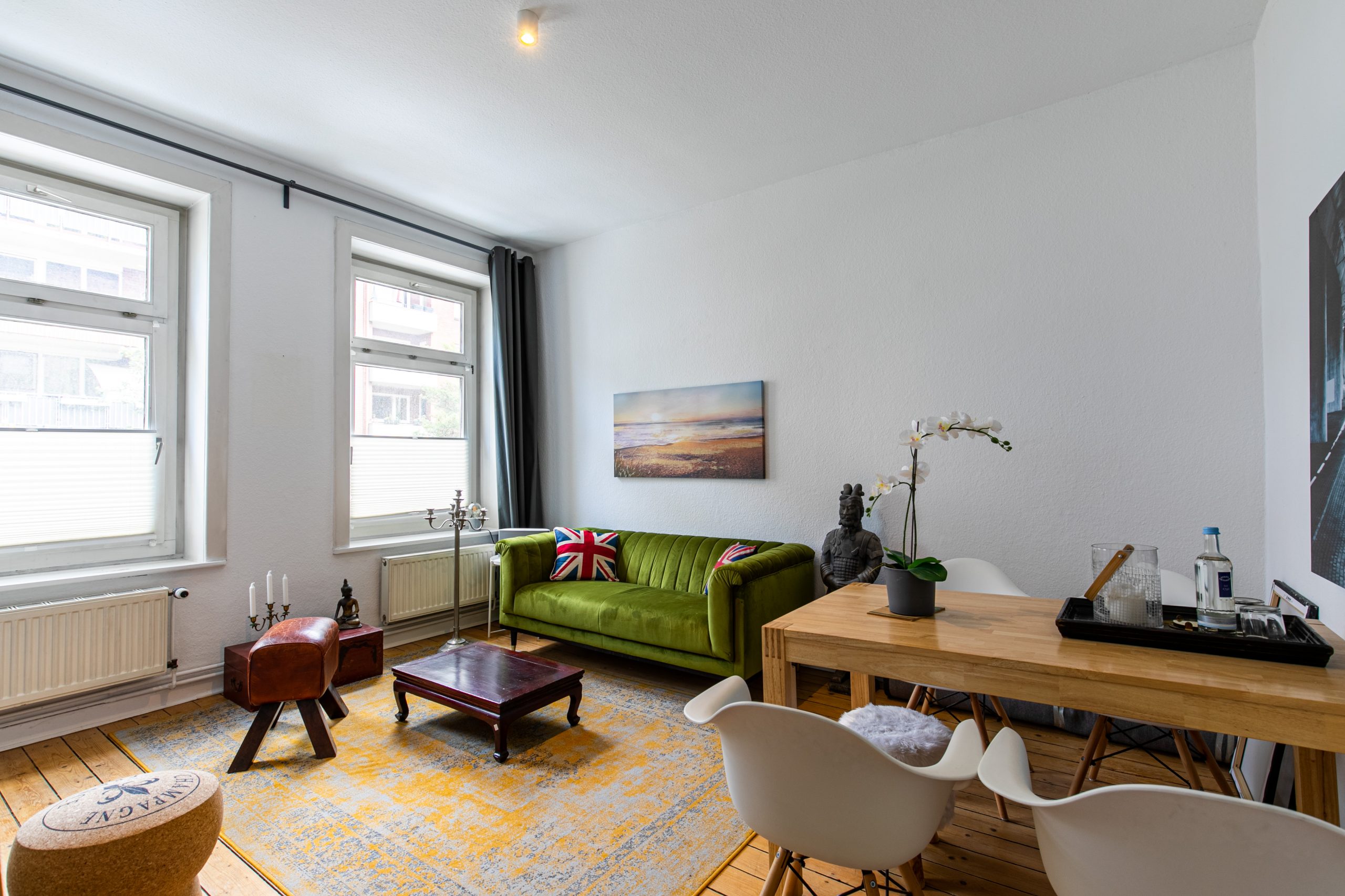 Es handelt sich um eine charmante Wohnung im 1. OG/Hochparterre mit hohen Decken und einem alten Holzdielenboden. Der Charme des Altbaus wird noch übertroffen, von dem wunderbaren Blick zur grünen Rückseite des Gebäudes. Zu dieser Seite ist das besonders ruhig gelegene Schlafzimmer ausgerichtet, sowie auch die Küche.