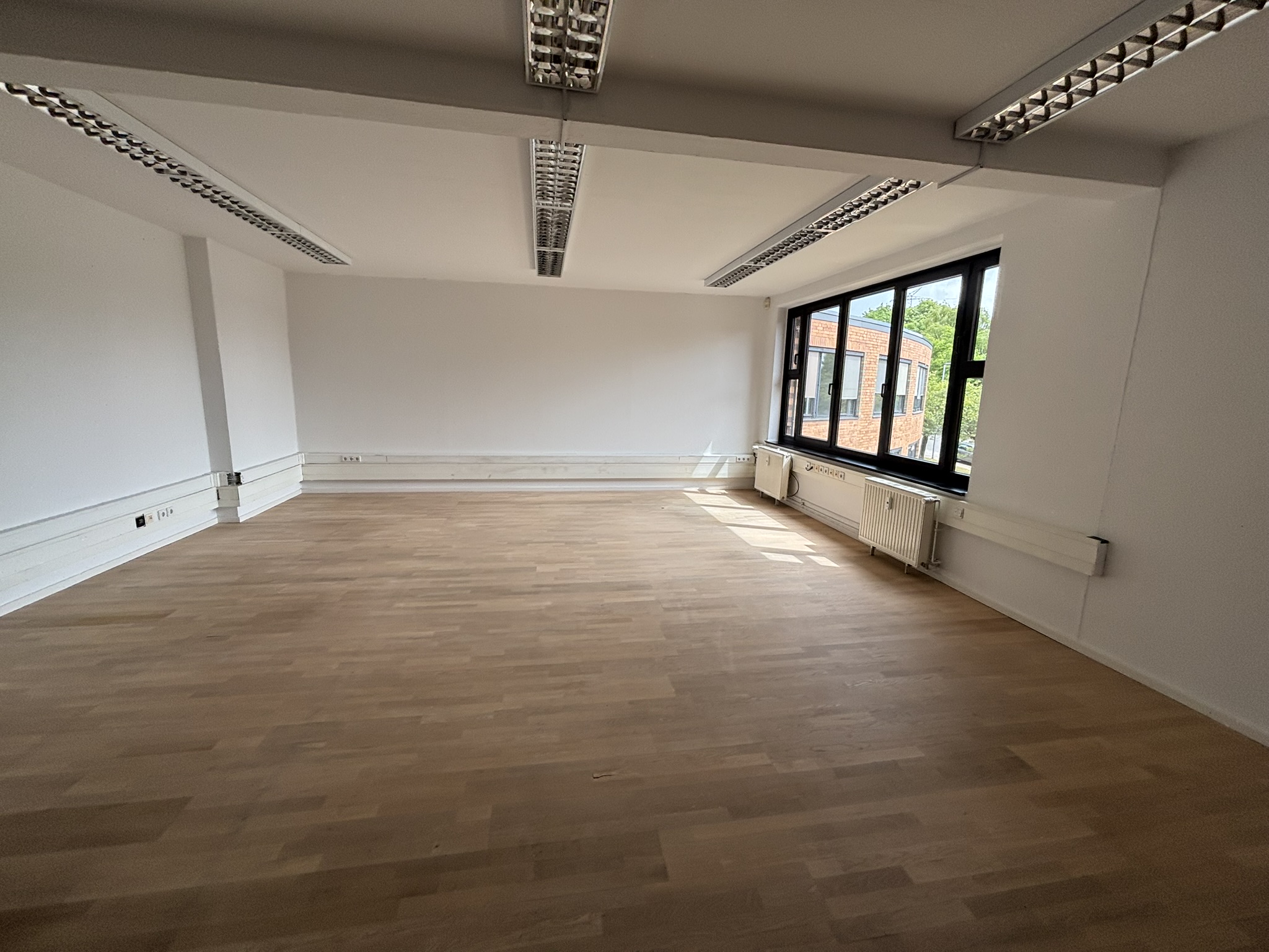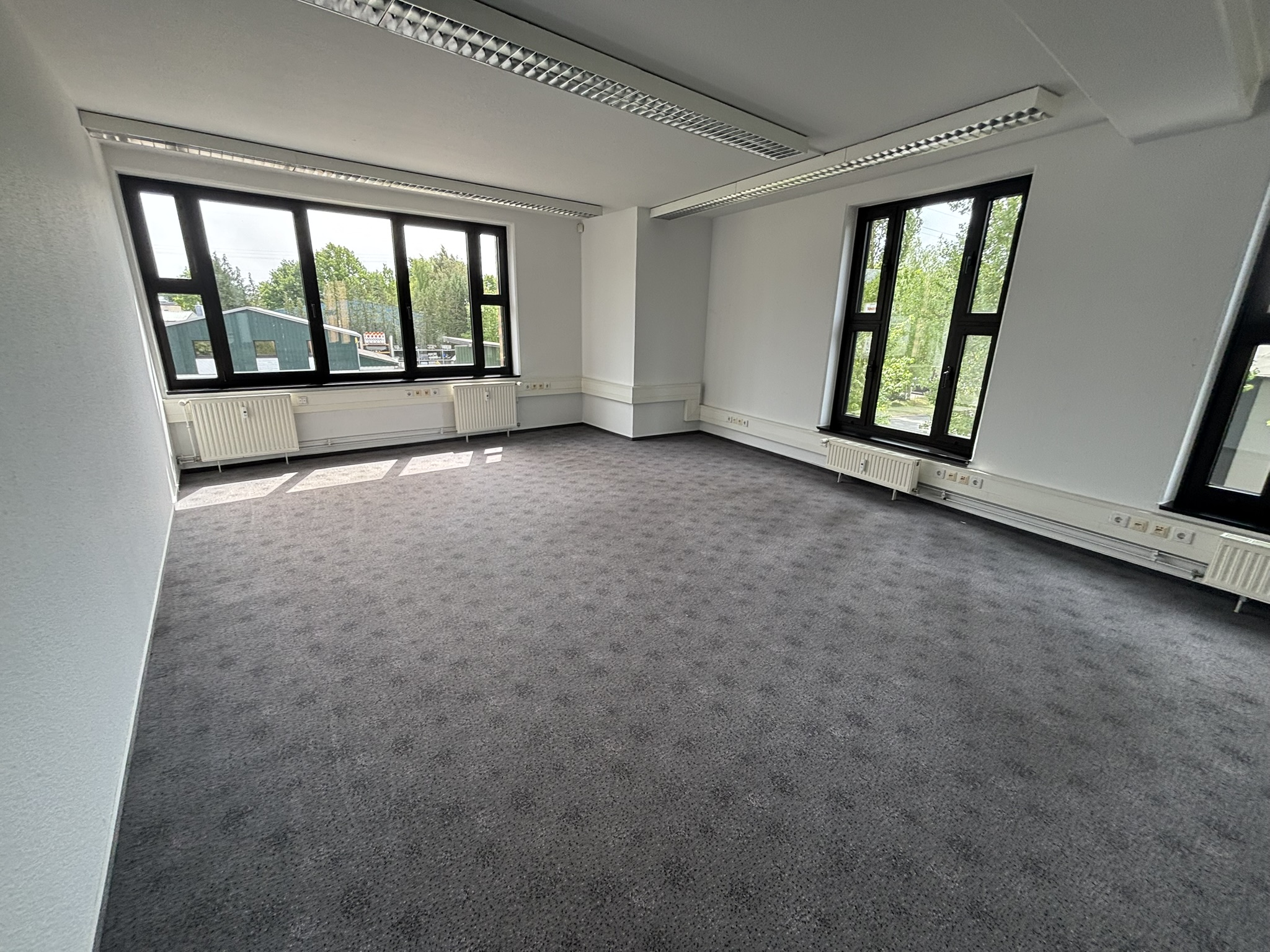 Im EG umfasst die Fläche mit ca. 408 m² die halbe Etage. Hinzu kommt im OG die ganze Etage mit ca. 855 m². Die Innenausstattung und Aufteilung kann nach Bedarf des Mieters angepasst werden und lässt eine sehr vielseitige Nutzung zu. Derzeit besteht das Büro aus einer Mischung aus Einzel- und Doppelbüros sowie auch größeren Räumen, die sich als Großraumbüro oder auch als Schulungsraum, Konferenzraum oder Versammlungsraum eigenen.
