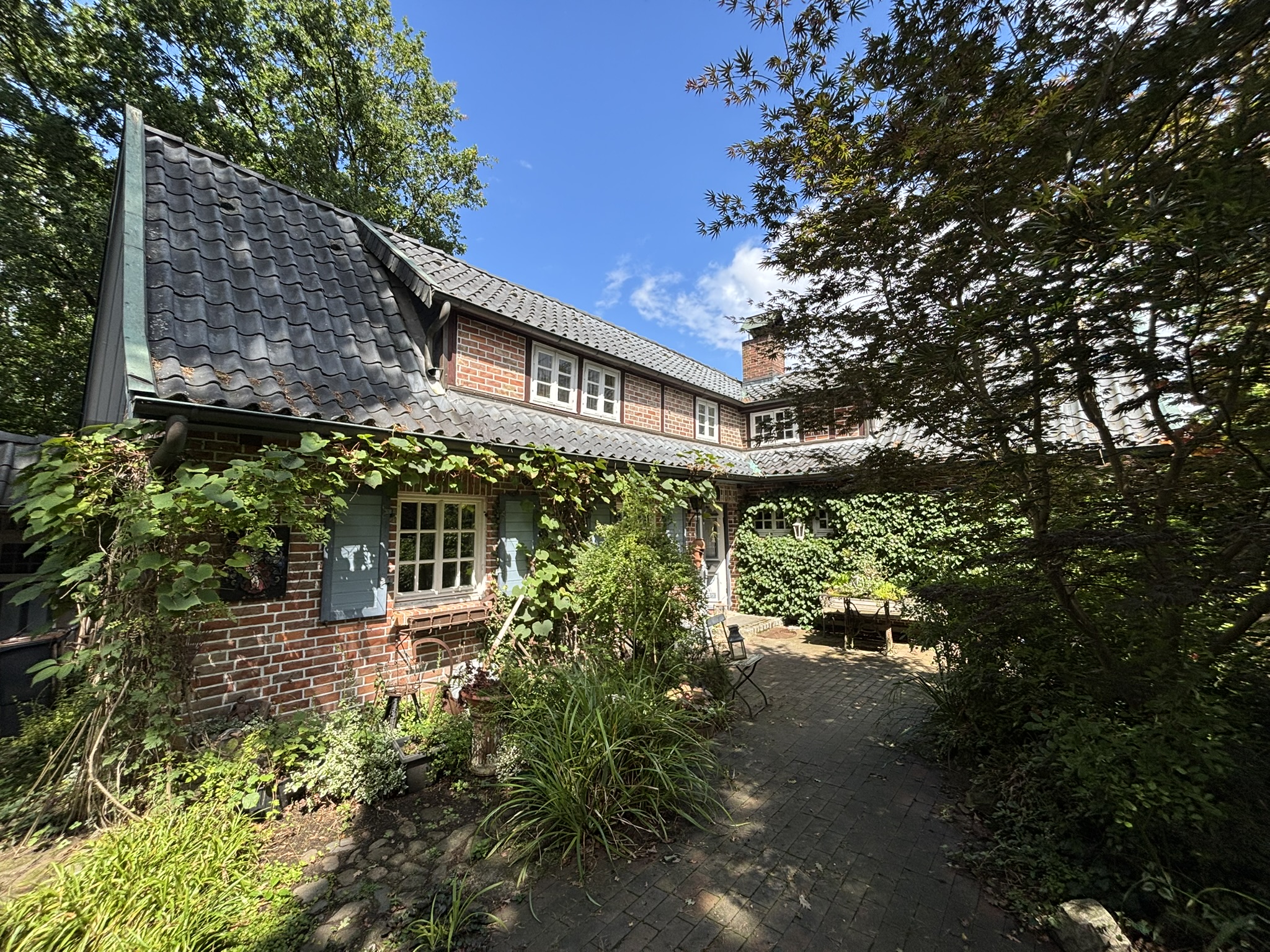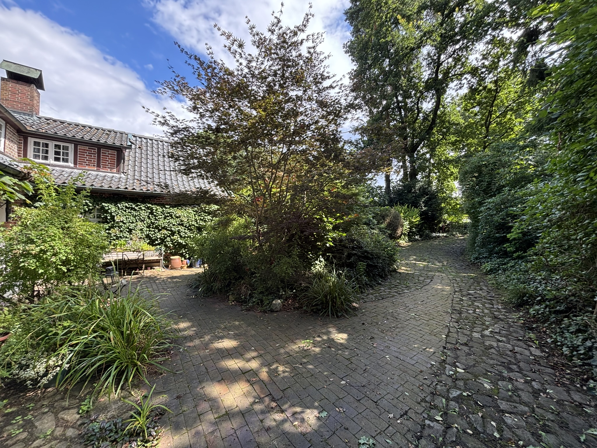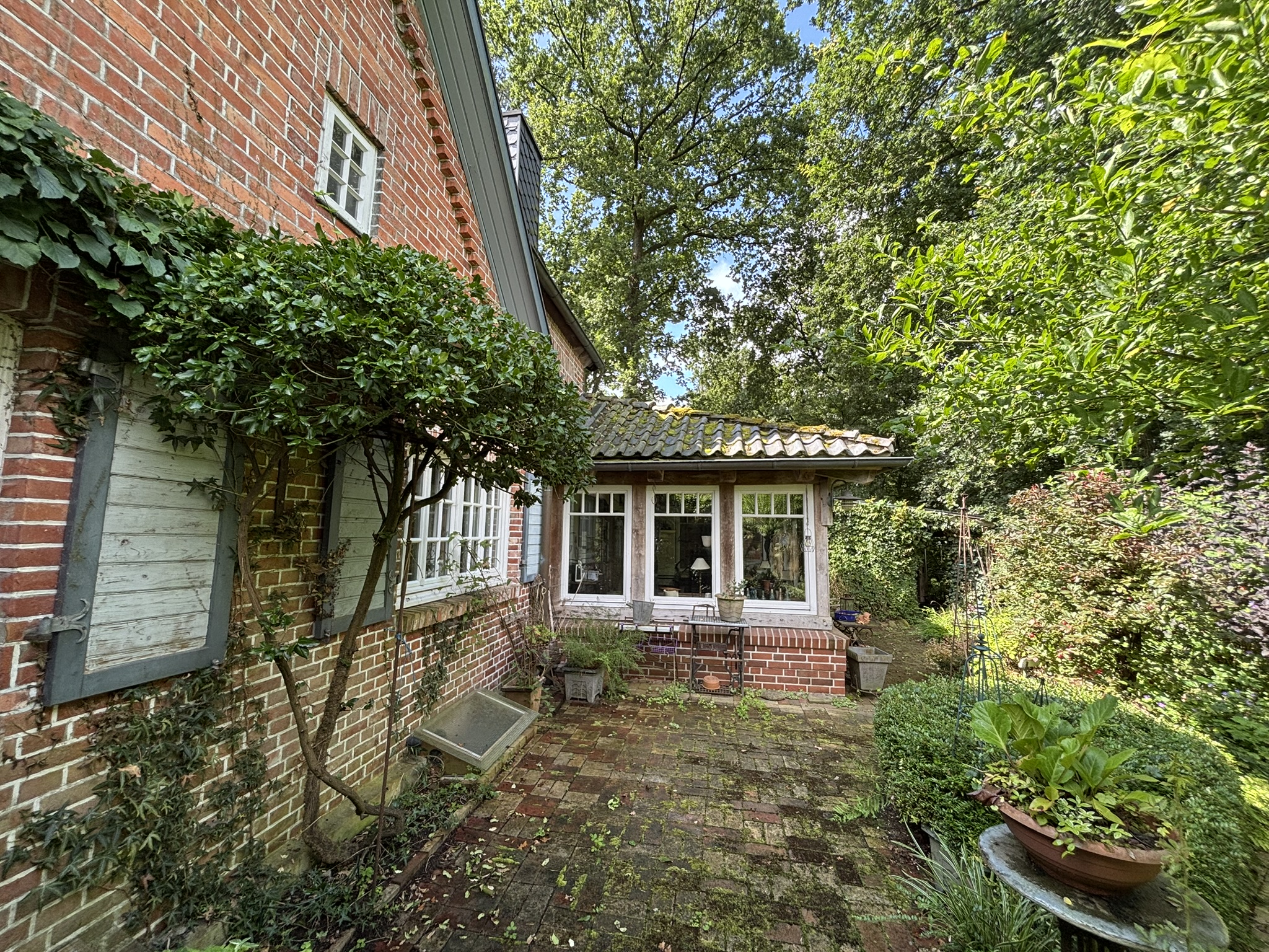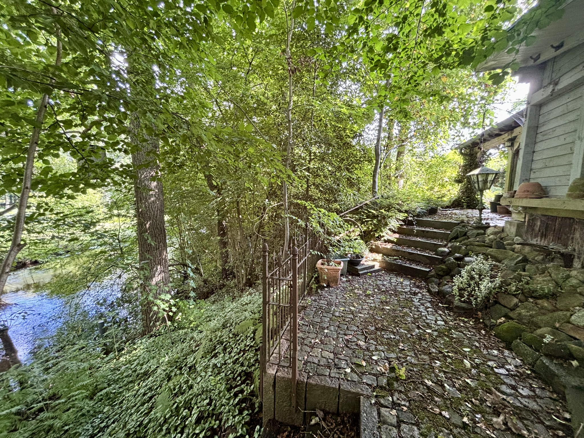 Das Haus befindet sich am Fluss Seeve, was eine idyllische und naturnahe Umgebung schafft. Das Grundstück ist großzügig bemessen und besticht durch seinen schönen Baumbestand, der Privatsphäre bietet und zum Verweilen im Freien einlädt. Hier können Sie entspannte Stunden im Grünen verbringen oder den Blick auf das Wasser genießen.